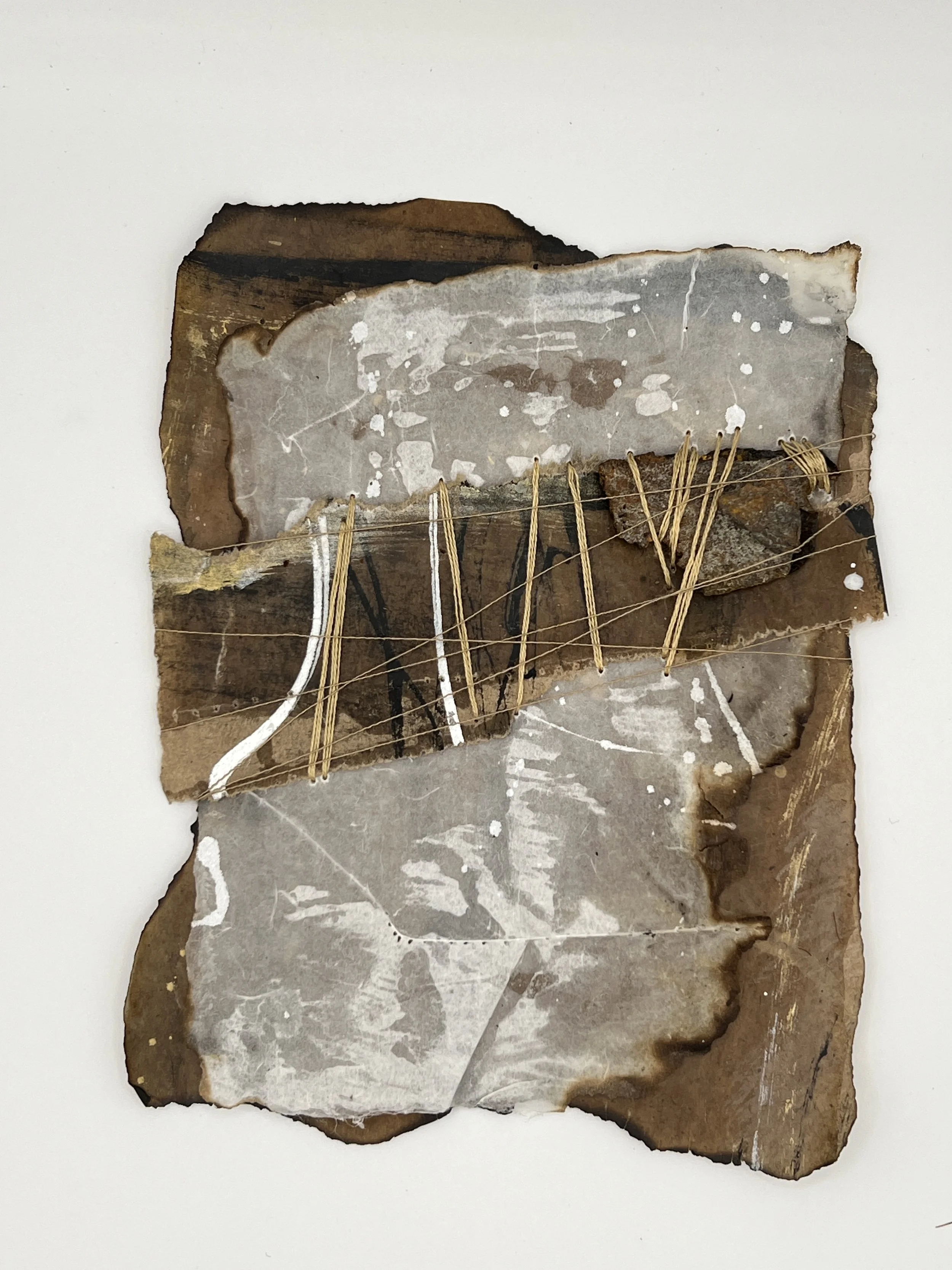 After lunch, Roberta will demonstrate techniques for creating collage papers and fabrics and how to treat various papers (washi, Chinese, rice, brown, old book pages) with acrylic/ink, machine stitch, asemic writing, encaustic. Students will start making their papers.