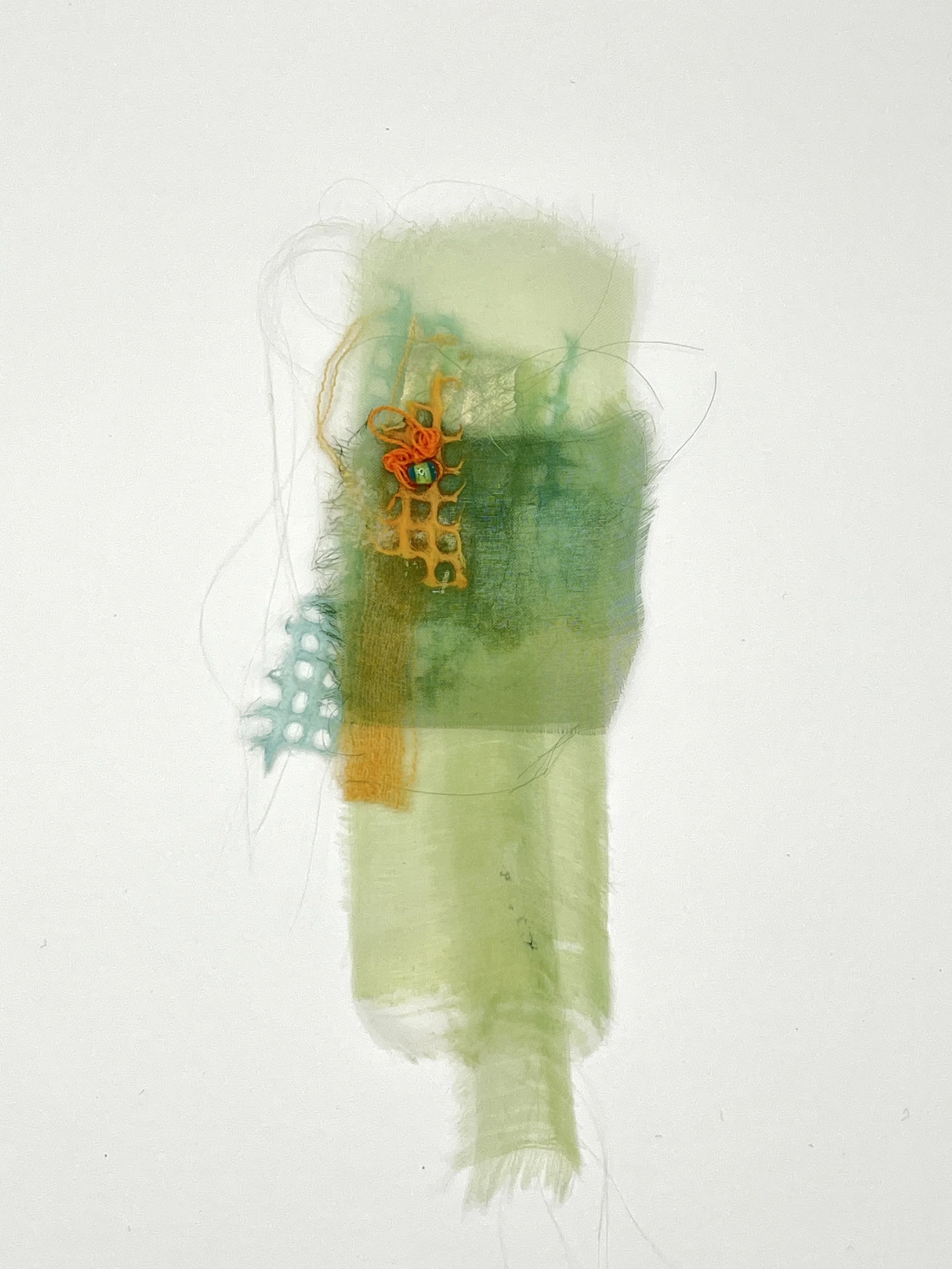 Wagner currently works primarily with ink, watercolor, pigments, encaustic, and acrylic on handmade Asian papers, silk, and cotton. She also embellishes works with handmade porcelain trinkets and beads, as well as machine and hand stitch.
