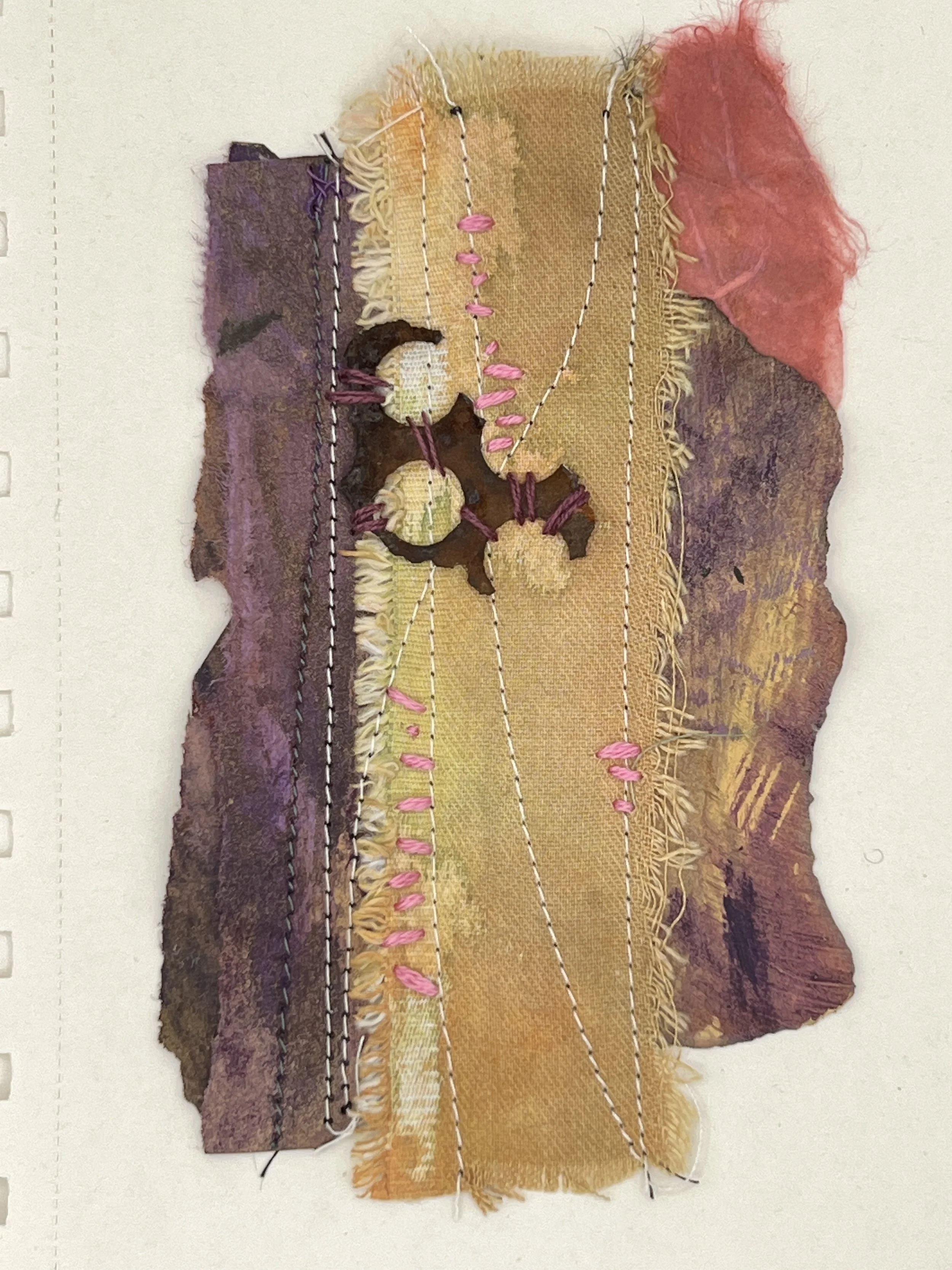 Day 2, April 25. Roberta will demonstrate acrylic and ink on fabric before you continue to make papers and work with your own fabric. There will be lots of sharing of ideas today. Roberta will also show her sample stitch book.